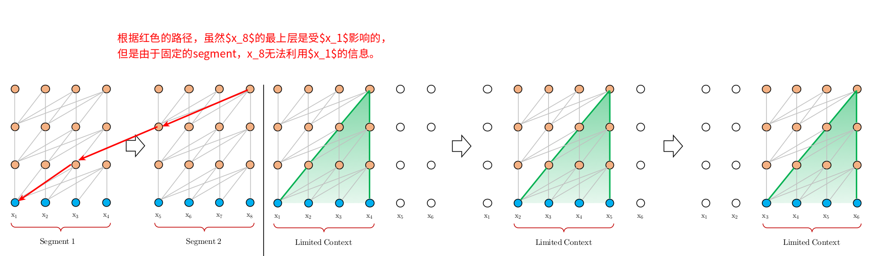 上图做是普通的Transformer语言模型的训练过程。假设Segment的长度为4,如图中我标示的:根据红色的路径,虽然x8的最上层是受x1影响的,但是由于固定的segment,x_8无法利用x1的信息。而预测的时候的上下文也是固定的4,比如预测x6时我们需要根据[x2,x3,x4,x5]来计算,接着把预测的结果作为下一个时刻的输入。接着预测x7的时候需要根据[x3,x4,x5,x6]完全进行重新的计算。之前的计算结果一点也用不上。