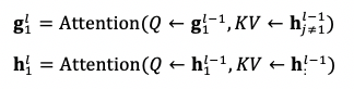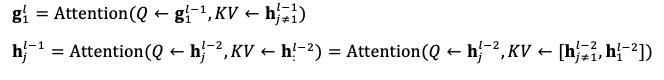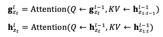 虽然计算 g{1}^{l} 时我们已经采取措施防止 h{1}^{l-1} 的信息泄露到 g{1}^{l} 中,但是考虑两层自注意力算子的计算: