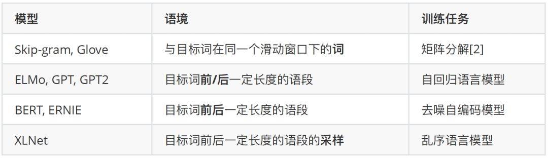 自词向量到如今以 XLNet 为代表的预训练语言模型,他们的主要区别在于对语境的不同粒度的建模: