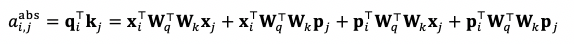 因为位置编码只在自注意力算子中起作用,我们将 Transformer 的自注意力权重的计算拆解成: