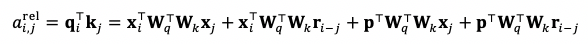 我们可以将其中的绝对位置编码 p{j} 的计算替换成相对位置编码 r{i-j},把 p{i} 替换成一个固定的向量 (认为位置 i 是相对位置的原点)。这样便得到相对位置编码下的注意力权重: