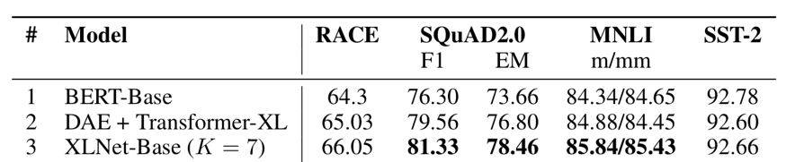 文章最后的消融分析很好地证明了乱序语言模型和 Transformer-XL 主干网络带来的提升。这部分实验采用和 BERT 一致的训练数据。以 BERT 为基础,将 BERT 的主干网络从 Transformer 换成 Transformer-XL 后,在需要建模较长上下文的阅读理解任务 RACE 和 SQuAD2.0 均有比较明显地提升 (对比 1&2 行)。而在此基础上加上乱序语言模型后,在所有任务上都有不同程度的提升 (对比 2&3 行)。