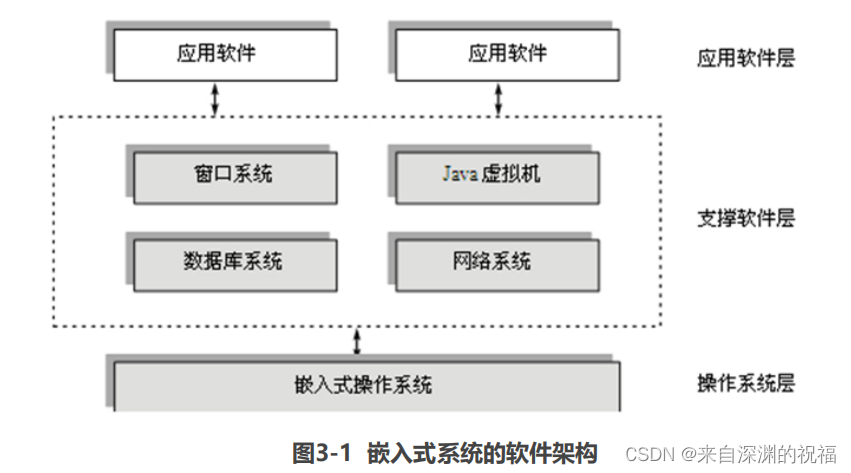 对于嵌入式系统来讲,软件的开发环境大部分在通用台式计算机和工作站上运行,但从逻辑上讲,它仍然被认为是嵌入式系统支撑软件的一部分。支撑软件一般用于一些浅度嵌入的系统中,如智能手机、个人数字助理等。嵌入式系统中的应用软件是系统整体功能的集中体现。系统的能力总是通过应用软件表现出来的。