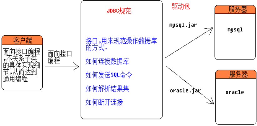 比如,连接mysql时,就使用mysql的驱动包;连接oracle时就使用oracle的驱动包。