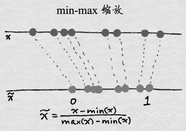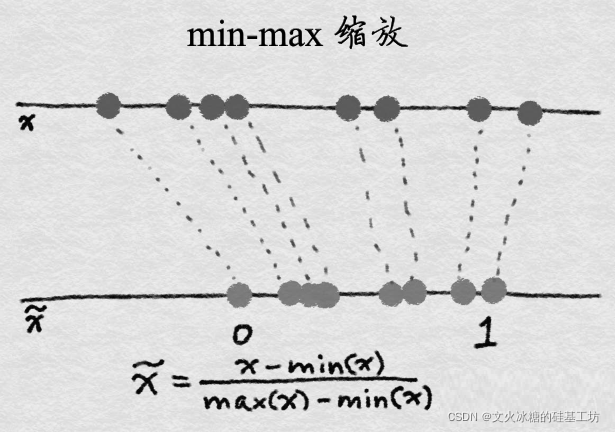 这种放缩方法,是把最小值转为0,最大值转为1,其它值在[0,1]之间等比例放缩。