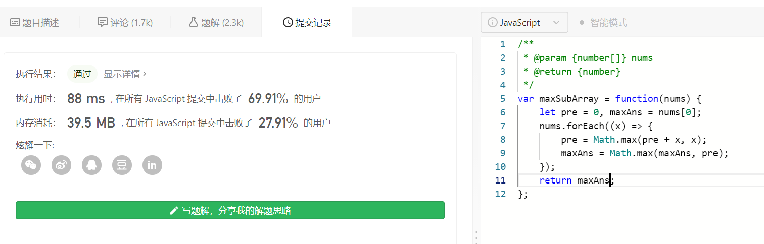 给定一个整数数组 nums ,找到一个具有最大和的连续子数组(子数组最少包含一个元素),返回其最大和。