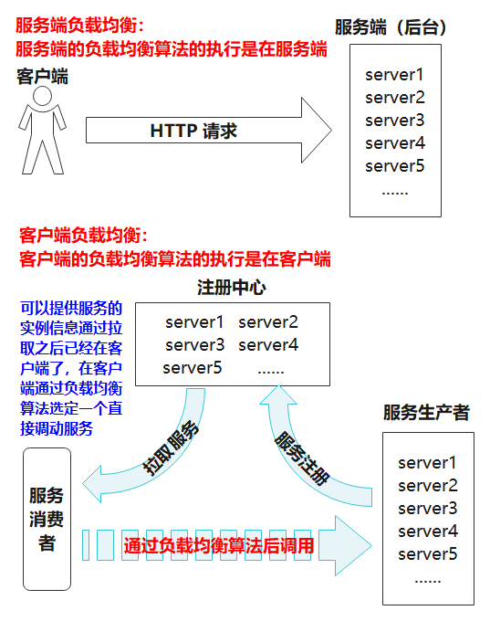 所谓客户端负载均衡,⽐如我们要说的 Ribbon,服务消费者客户端会有⼀个服务器地址列表,调⽤⽅在请求前通过⼀定的负载均衡算法选择⼀个服务器进⾏访问,负载均衡算法的执⾏是在请求客户端进⾏。