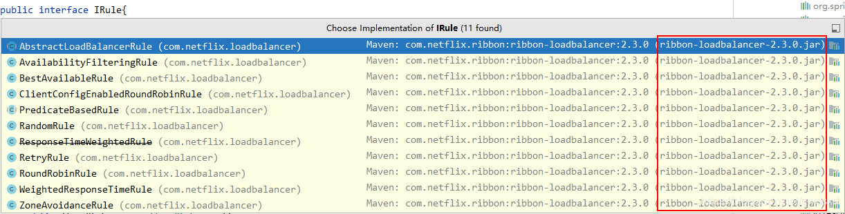 Ribbon内置了多种负载均衡策略,内部负责复杂均衡的顶级接⼝为com.netflix.loadbalancer.IRule,类树如下
