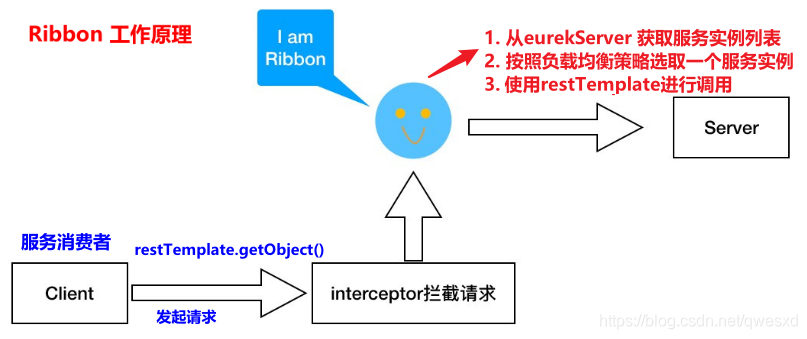 当服务消费者通过被 @loadBanlancer 修饰过的 restTemplate 调用服务端时,ribbon 会根据服务提供者的服务名获取到该服务对应的实例列表,并按照⼀定的负载均衡策略从实例列表中获取⼀个实例 Server,并最终通过 RestTemplate 进⾏请求访问