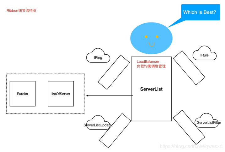 图中核⼼是负载均衡管理器 LoadBalancer(总的协调者,相当于⼤脑,为了做事情,协调四肢),围绕它周围的多有 IRule、IPing 等