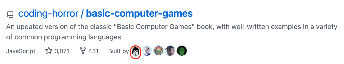 今天介绍的 basic-computer-games 开源项目发起者杰夫·阿特伍德(Jeff Atwood)就是那一代程序员。我说看他的头像这么眼熟,原来那个是 Coding Horror 博客的 LOGO,我看过他的书。