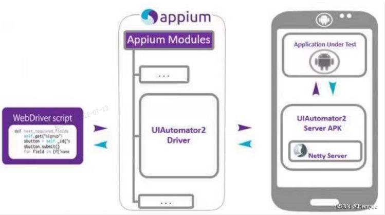在安卓端里Appium是基于WebDriver协议进行通信,将具体的元素操作命令转发给io.appium.uiautomator2.server,驱动输入UiAutomator2的命令,实现App的自动化测试。
