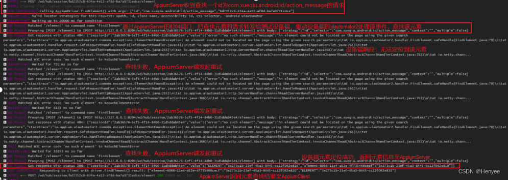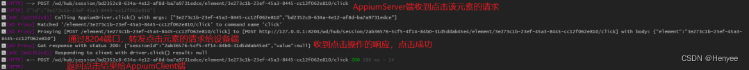 ②元素定位、操作等请求,将接收到AppiumClient发送的element/click等请求转发给io.appium.uiautomator2.server,驱动uiautomator2的命令去执行相应的操作,并检查命令的执行结果,返回结果给AppiumClient。