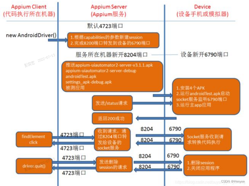 用例的执行过程,涉及:Appium-Client与Appium-Server、Appium-Server与安卓设备、设备间的通信,整体流程如下