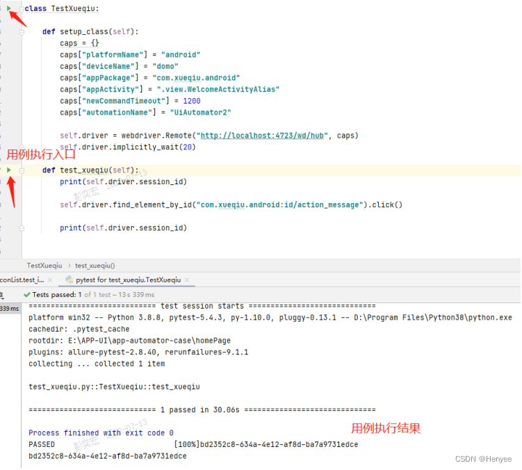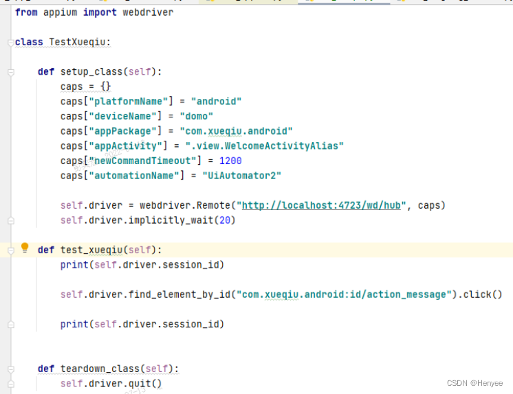 以上代码的作用:打开雪球APP,定位到首页的消息按钮,点击进入后,退出APP,打印用例执行过程中的sessionID