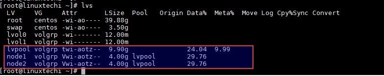 [root@linuxtechi ~]# lvs /dev/volgrp/lvpool && lvs /dev/volgrp/node{1..2}