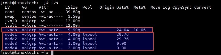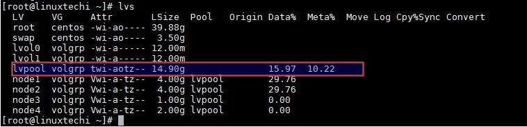 [root@linuxtechi ~]# lvcreate -V 4G -T volgrp/lvpool -n node2