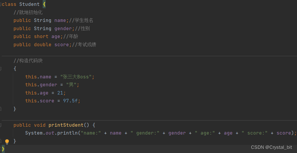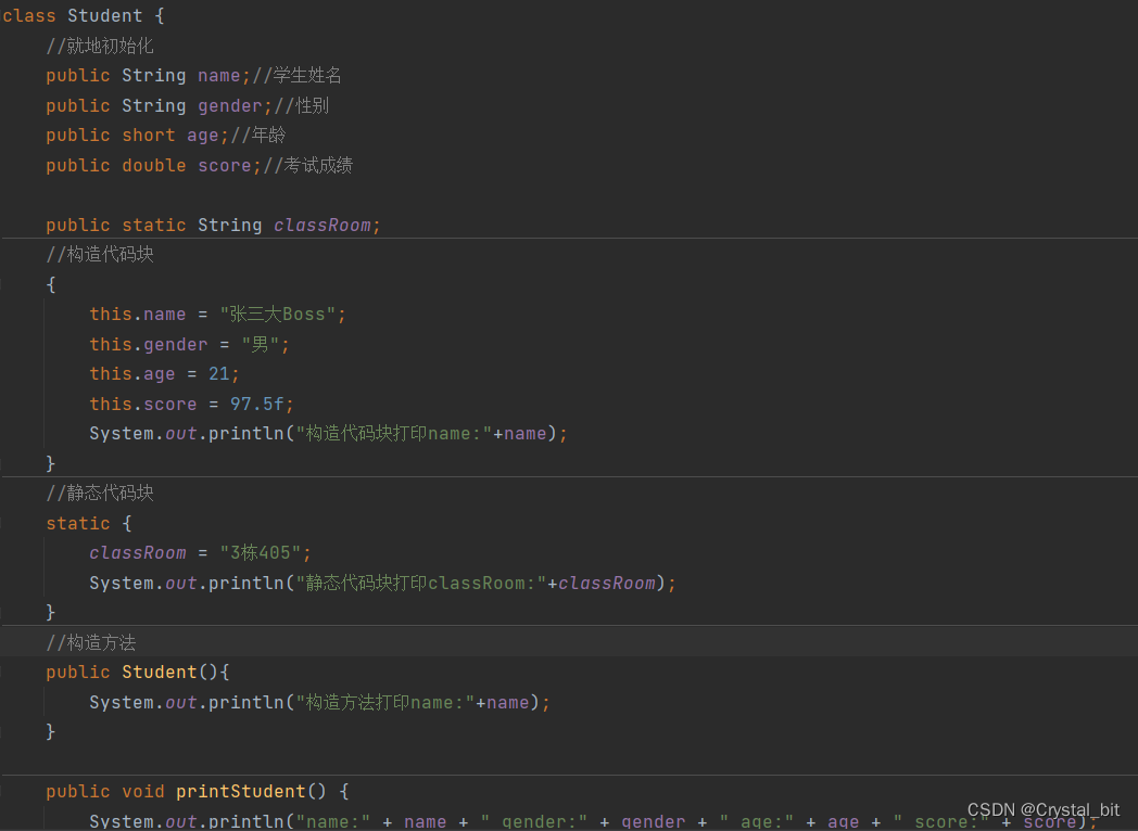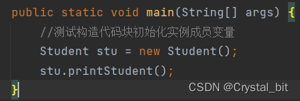 定义在类中的代码块(没有任何修饰符),别名:实例代码块/非静态代码块。一般用于初始化实例成员变量。如图: