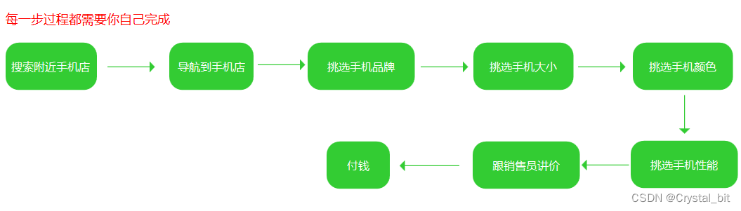 你买手机的每一个具体步骤都需要你自己来完成,每个人买手机的方式都各不相同,南方人和北方人因为所处地域不一样,手机店的位置就不同;每个手机店卖的手机品牌也不同。只要哪个环节不一样代码就会很复杂,而且如果你买的不是手机而是电脑,那就得重新实现了。这样代码的复用性就不高了,就会不便于扩展和维护。