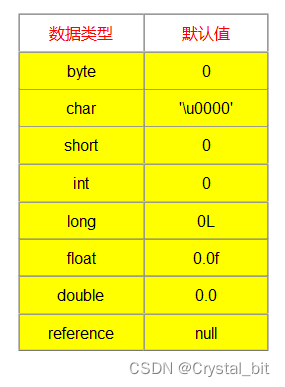 之前给大家说成员变量会有默认值,其实在创建一个对象时,程序是有很多步骤的,给成员变量设置初始值仅仅只是其中的一步而已。至于到底是哪些步骤大家现在不用深究,对应数据类型的默认值图表如下: