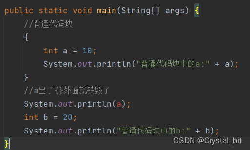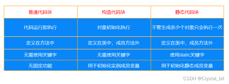 使用{}定义的一段代码称为代码块。根据位置和关键字分为四种:普通代码块,构造代码块,静态代码块,同步代码块(使用synchronized关键字加上一个锁对象来定义一段代码,这就叫同步代码块。在后面写多线程博客会给大家说到)。