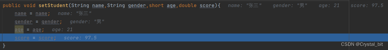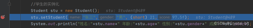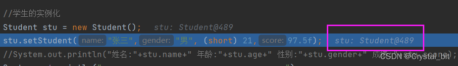 stu.setStudent("张三","男", (short) 21,97.5f);