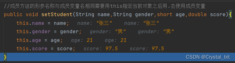 //成员方法的形参名称与成员变量名相同需要用this去指向当前对象之后用.去访问其成员变量