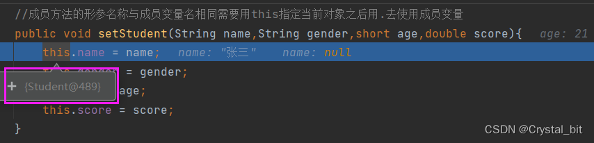 通过调试可以看出this引用指向的当前调用成员方法的对象。当前对象的成员变量可以通过this.去访问并赋值。