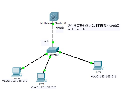 三层交换机是不能直接配置trunk的,因为他的接口是auto模式,需要封装一下
