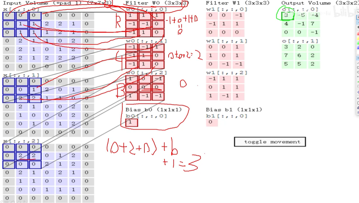 还是上面这张图,可以看到输入层上写着+pad 1这个就是边缘填充。根据移动规律,越在中间的点对特征值的影响越大,反而那些比较边缘的的点,对特征值的影响不是很大,所以要想输入层的值对特征值产生影响,就得把原有的值往中间靠,这时就出现了边缘填充,也就是图中外面一圈灰色的0。当然这个填充可以填充多层,且必须填充0,因为填充其他值会对特征值产生影响。