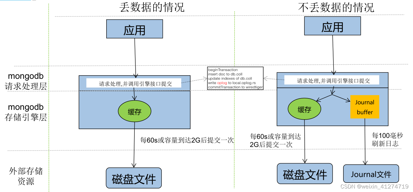 WiredTiger的写操作会默认写入 Cache ,并持久化到 WAL (Write Ahead Log),每60s或Log文件达到2G做一次 checkpoint (当然我们也可以通过在写入时传入 j: true 的参数强制 journal 文件的同步 ,writeConcern