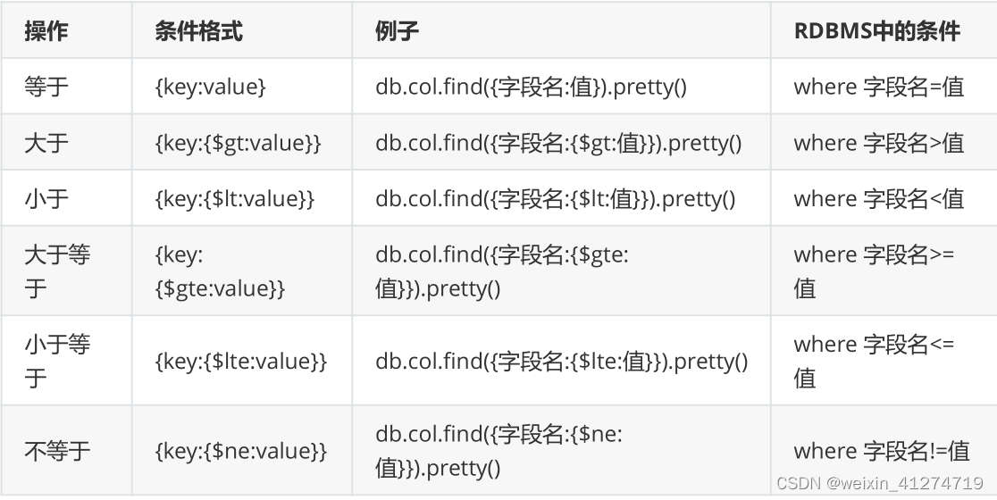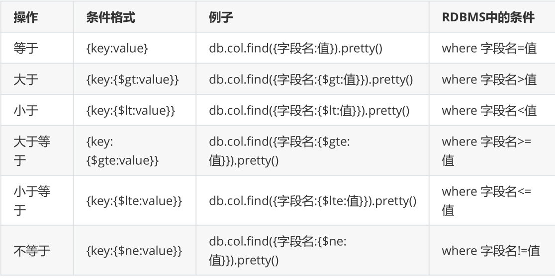 db.集合名.find({key:{$not:{$操作符:value}}).pretty()