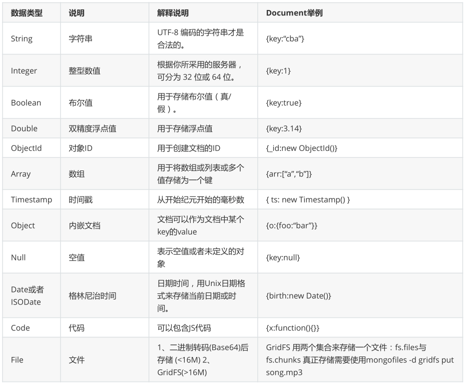 {key:value,key2:value2} 这是一个BSON的例子,其中key是字符串类型,后面的value值,它的类型一般是字符串,double,Array,ISODate等类型。