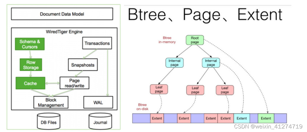 Cache是基于BTree的,节点是一个page,root page是根节点,internal page是中间索引节点,leaf page真正存储数据,数据以page为单位读写。WiredTiger采用Copy on write的方式管理写操作(insert、update、delete),写操作会先缓存在cache里,持久化时,写操作不会在原来的leaf page上进行,而是写入新分配的page,每次checkpoint都会产生一个新的root page。