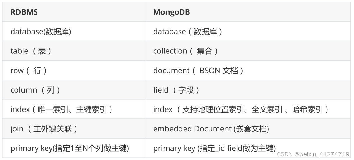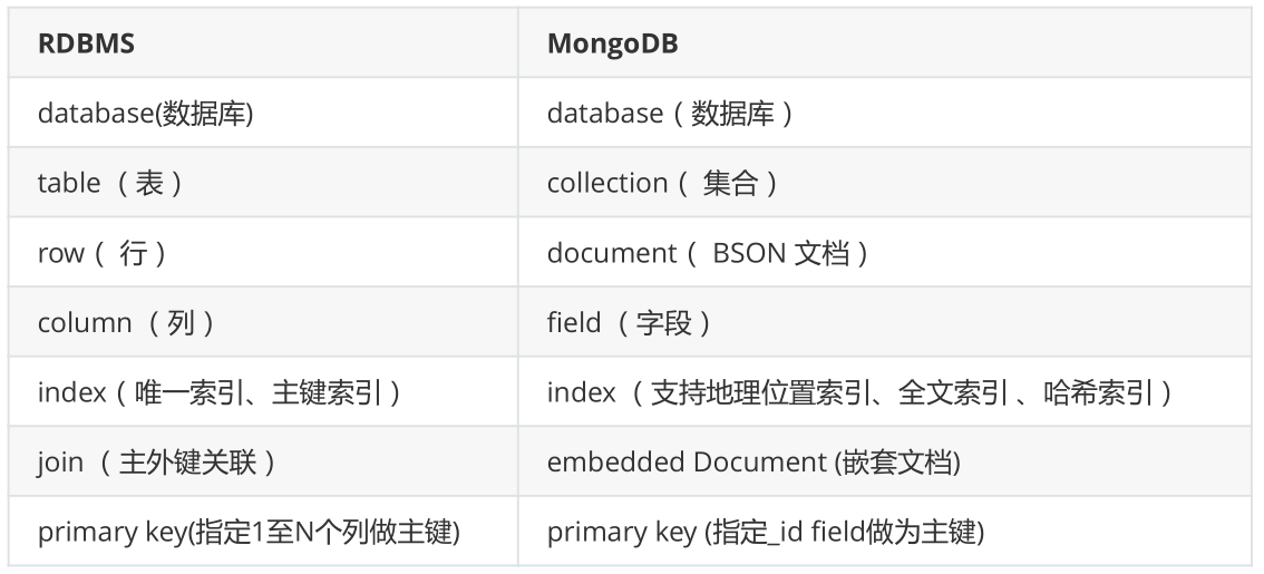 1.3 MongoDB 和RDBMS(关系型数据库)对比