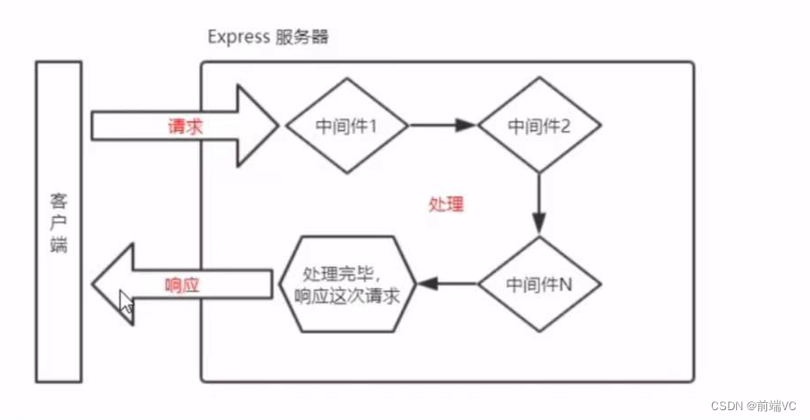 每次一个请求到达服务器之后,需要先经过路由的匹配,只有匹配成功后,才会调用对应的处理函数。在匹配时,会按照路由的顺序进行匹配,如果请求类型和请求的URL同时匹配成功,则express会将这次请求,转交给对应的function处理函数进行处理