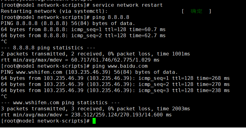 然后重启网络服务,能ping通8.8.8.8,证明已经可以连外网了,能ping通网站,证明DNS也设置好了,如果ping不同,请检查windows和linux的防火墙设置