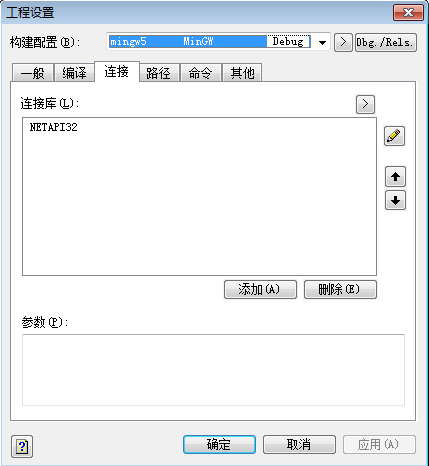 在CFree里,工程设置,如下图,找到NETAPI32.lib,加入进来;然后把路径名和文件后缀,都去掉;才能构建成功;