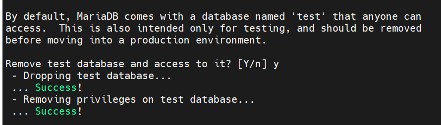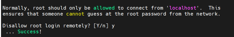 输入y,回车,允许root远程登录,然后选择是否删除test测试库
