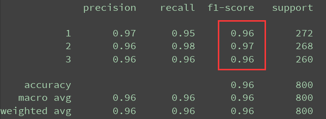 对于这样的数据集我们更关注f1,因为并不是一个均衡样本数据并不关注任何一点。训练集和测试集表现都较好,大部分数据预测正确。