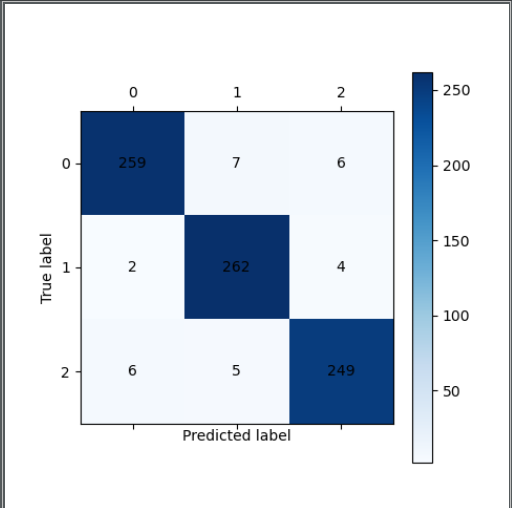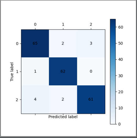 def cm_plot(y, yp): from sklearn.metrics import confusion_matrix import matplotlib.pyplot as plt cm = confusion_matrix(y, yp) plt.matshow(cm, cmap=plt.cm.Blues) plt.colorbar() for x in range(len(cm)): for y in range(len(cm)): plt.annotate(cm[x, y], xy=(y, x), horizontalalignment='center', verticalalignment='center') plt.ylabel('True label') plt.xlabel('Predicted label') return plt