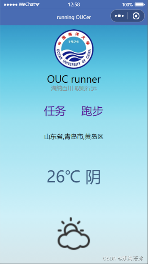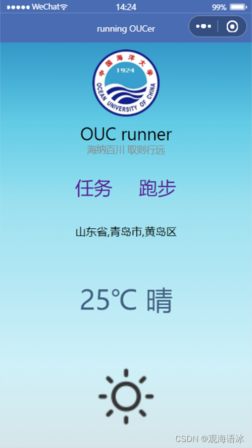 Index页面为微信小程序的首页,主要有包含“任务”和“跑步”的导航栏和查询天气的功能