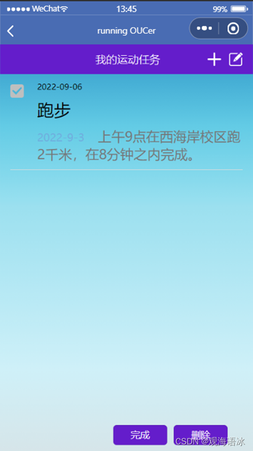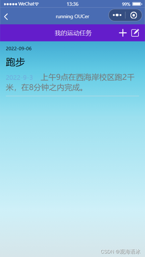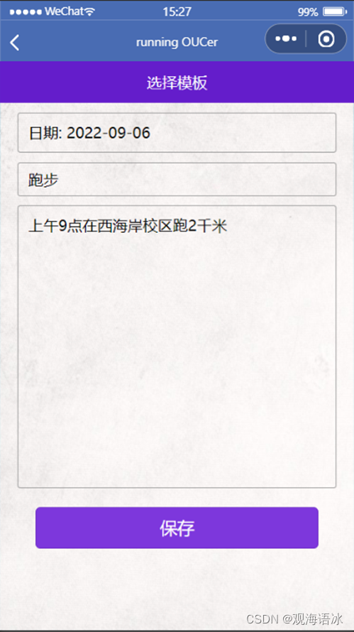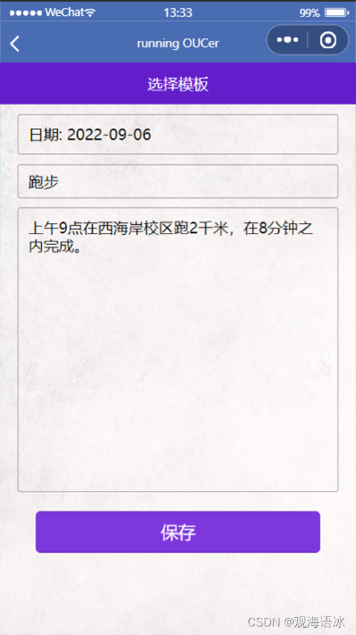 通过日期选择器选择做运动的具体日期,然后再标题栏写上“跑步”这个运动项目,在内容栏写上具体运动的细节,比如“上午9点在西海岸校区跑2千米,在8分钟之内完成。”