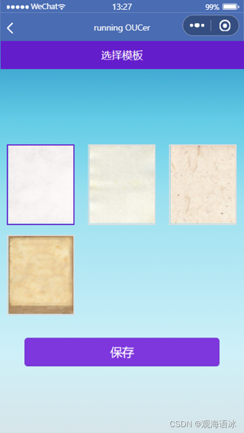 使用的技术:因为模板是由四张图片组成,这四个模板有很高的相似性,所以在组件上使用wx:for控制属性绑定一个数组,然后使用数组中各项的数据重复渲染该组件。