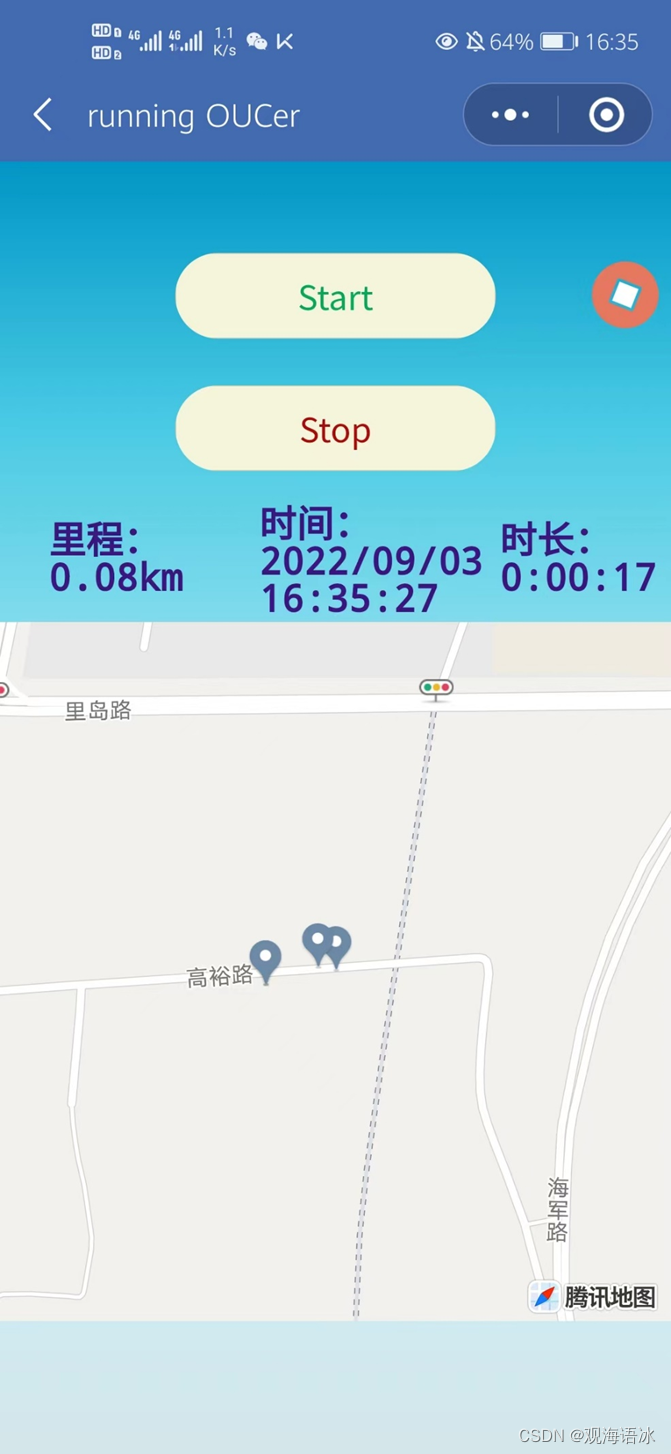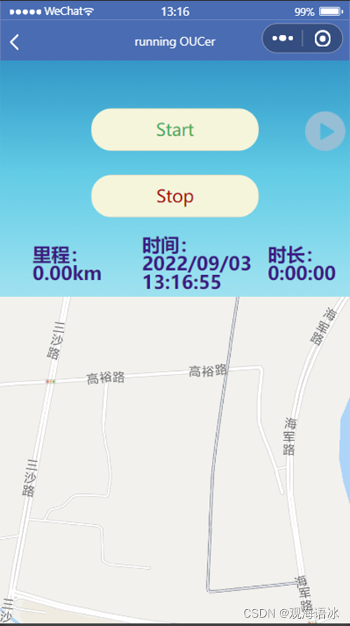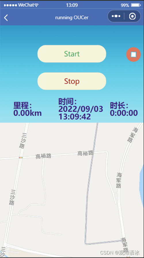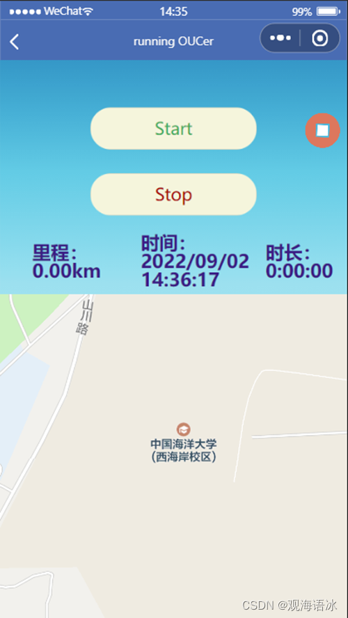 点击“Start”按钮的时候,微信小程序就开始记录跑步时长和跑步里程了,点击“Stop”按钮的时候,微信小程序就会暂停记录跑步时长和跑步里程。