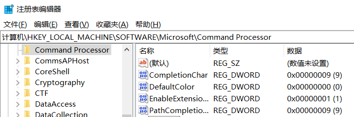 在运行中输入regedit,进入注册表后,找到"计算机\HKEY_LOCAL_MACHINE\SOFTWARE\Microsoft\Command Processor"的路径。