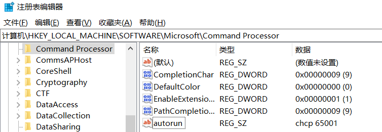然后在右侧框的空白处点击“右键-新建-字符串值”,“名称”列填写autorun,数值数据填写chcp 65001,保存成功后,每次重启cmd时的默认编码都会自动默认为65001(UTF-8)。