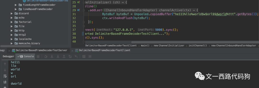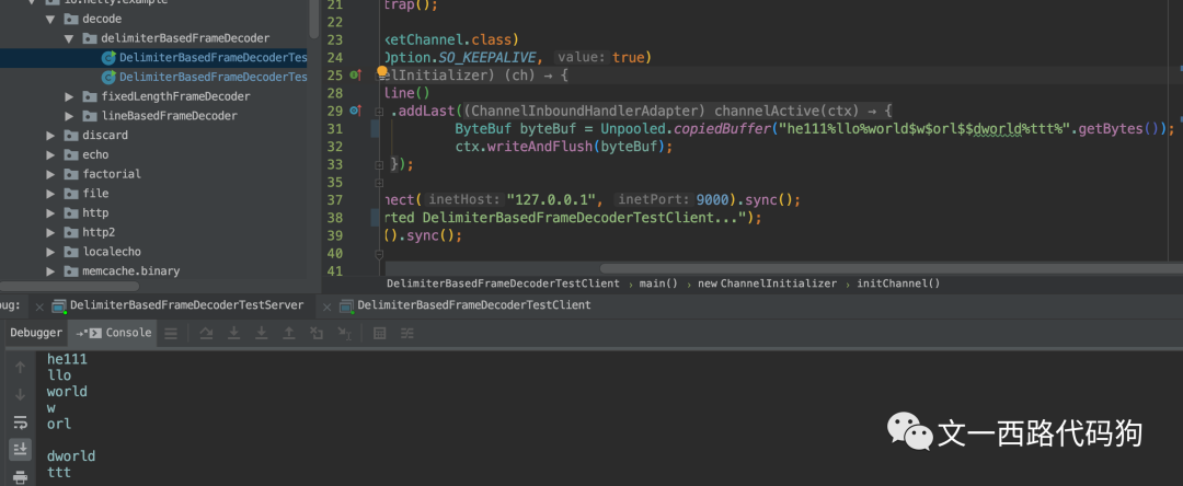下面是DelimiterBasedFrameDecoder的一个简单小应用测试,模拟使用不同的分隔符发送不同信息服务端使用DelimiterBasedFrameDecoder解码出来的信息是什么样的。