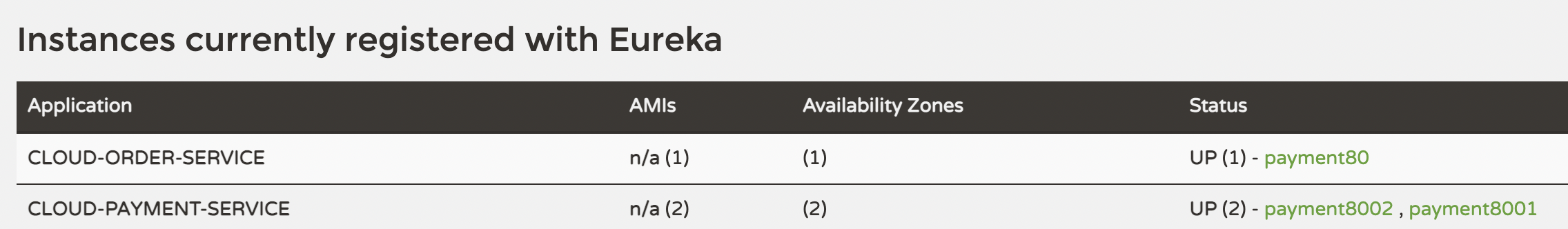 服务注册中心上有两个服务:CLOUD-ORDER-SERVICE 和 CLOUD-PAYMENT-SERVICE