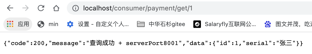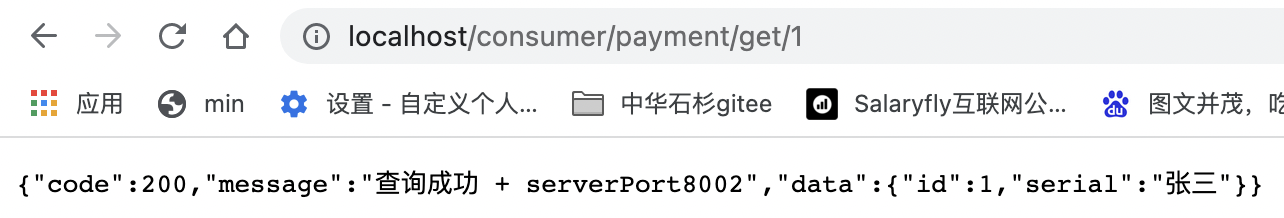 在浏览器中输入http://localhost/consumer/payment/get/1,多次刷新可以看到,提供服务的应用在不同的切换,实现负载均衡的效果。